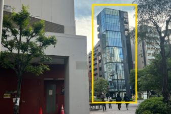 そのまま突き当たると斜め右にガラス張りの10階建てのビルがありますので、お入りいただき1階の総合受付までお越しください。